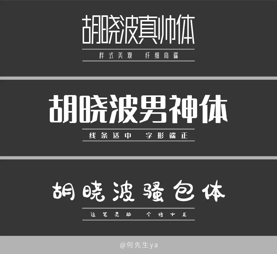 由胡晓波工作室团队开发的字体,三款字体风格各不相同,定位明确。分别是胡晓波真帅体、胡晓波男神体、胡晓波骚包体。