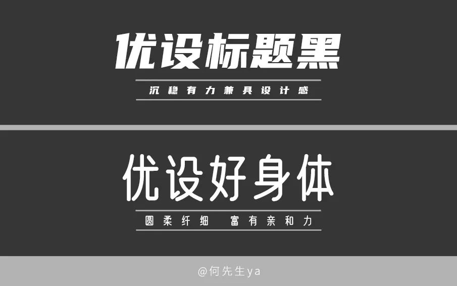 优设网与字由联合发布针对标题使用的免费字体,优设标题黑,沉稳有力兼具速度感,优设好身体的整体气质偏向圆柔纤细,设计上更加富有亲和力和现代感,两套字体互为补充,可以覆盖绝大多数的设计场景。