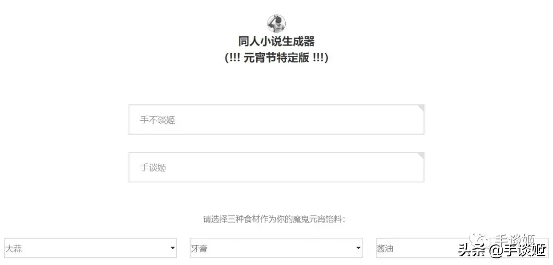 顾名思义是生成同人爱情小说的,输入两人的名字,选择三种食材,就能生成一篇“甜腻”的元宵节主题爱情文章。