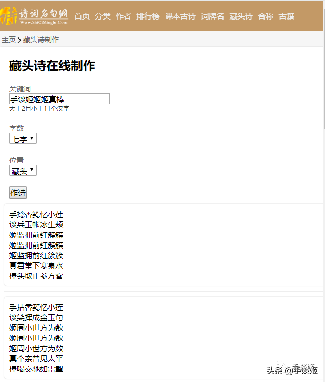 藏头诗生成器(http://www.shicimingju.com/cangtoushi/index.html)