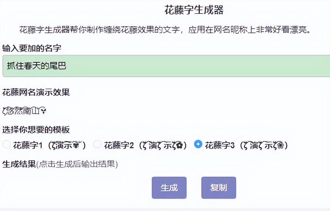 4.结果生成后,点击复制按钮,可以到网名修改处进行粘贴使用。