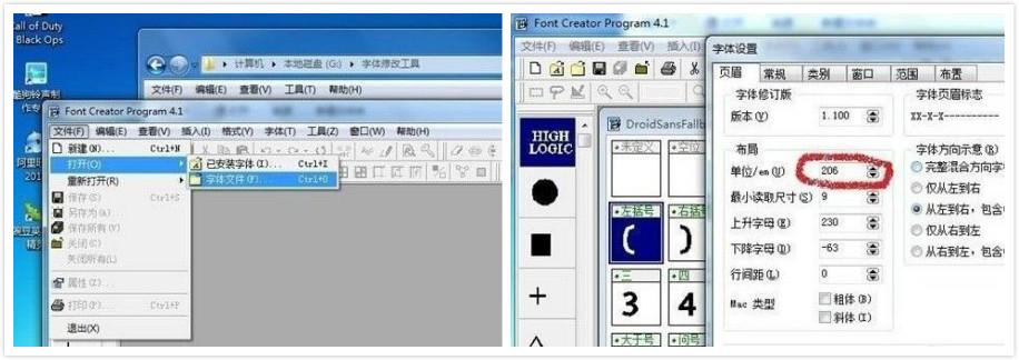 3、然后提取该文件放至SD卡上,再使用字体修改器打开,点击格式—设置—布局—然后在“单位”框里输入206(默认是256),需要说明的是,输入的数字越小字体会越大。