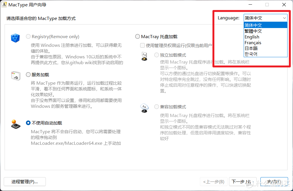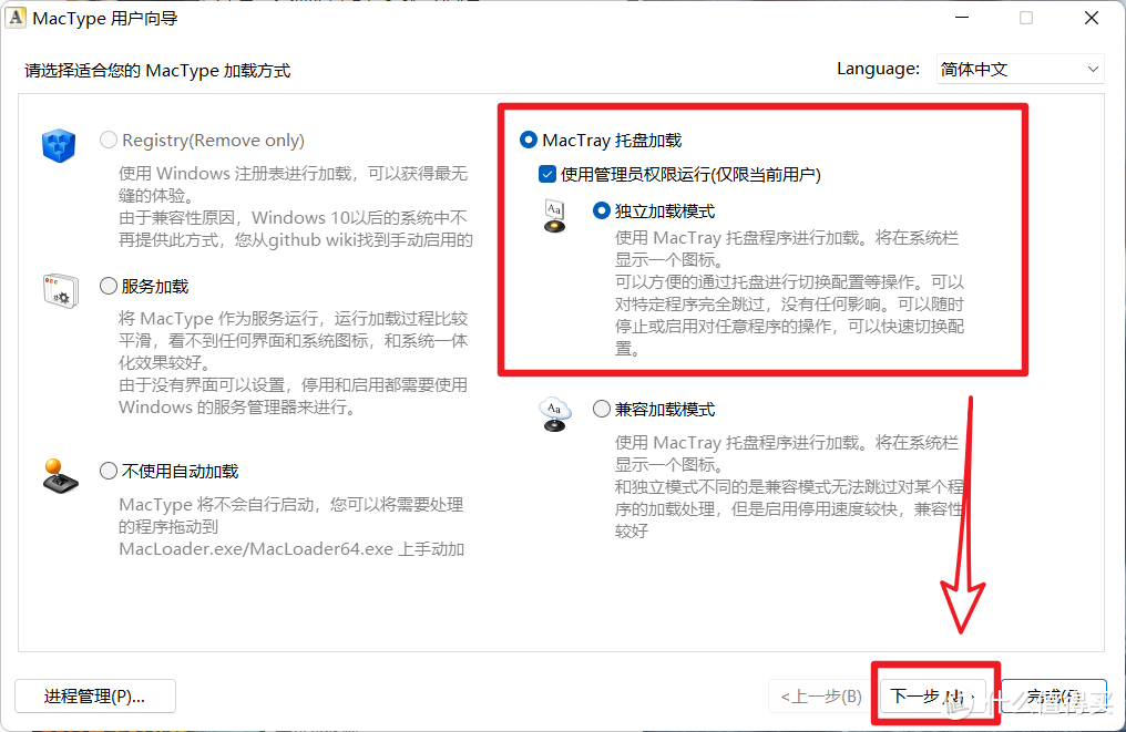 然后按照上图选择 MacType托盘加载—独立加载模式 ,完成后点击下一步 。