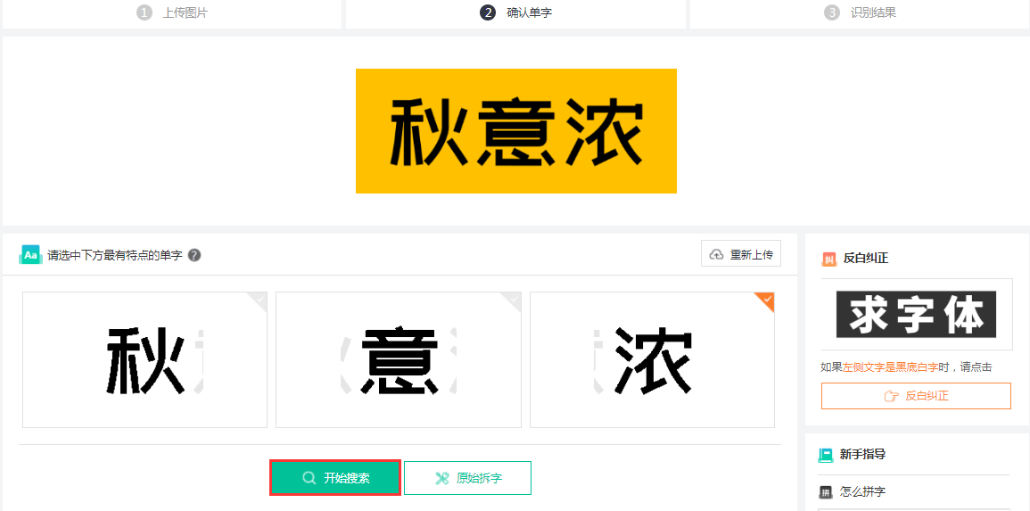 在完成第1步上传图片操作后求字体网分别对"秋""意""浓"三个字进行了识别。接下来在"请选中下方最有特点的单字"下方,将鼠标悬停在"浓"字上面,单击"浓"字下方出现的"确认完整单字"按钮。