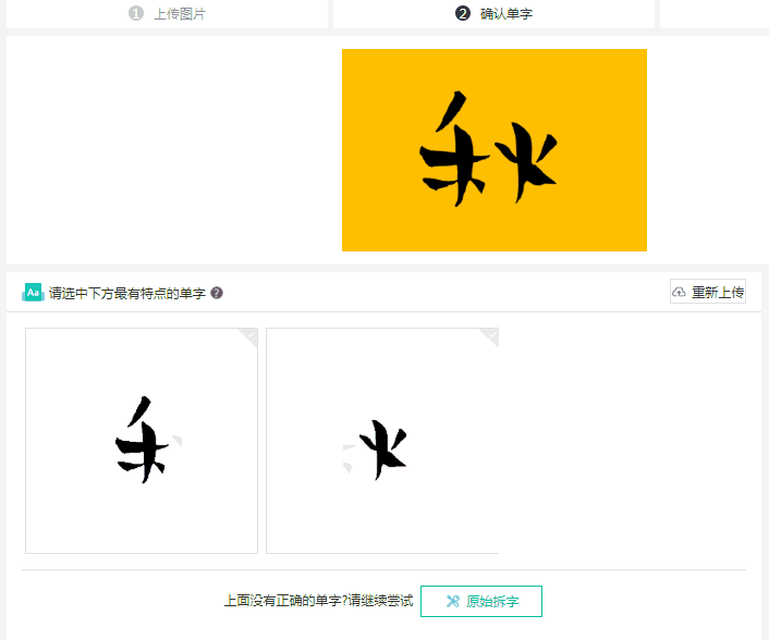 有时候文字截图上传到求字体网后,网站不能识别成完整的单字,而是识别成文字拆分后的各个组成部分。这时候需要多进行一个自己手动拼字的操作,把文字的不同组成部分拖曳到一起拼成一个完整的字,再"确认完整单字" ,然后再点击"开始搜索"按钮识别结果。