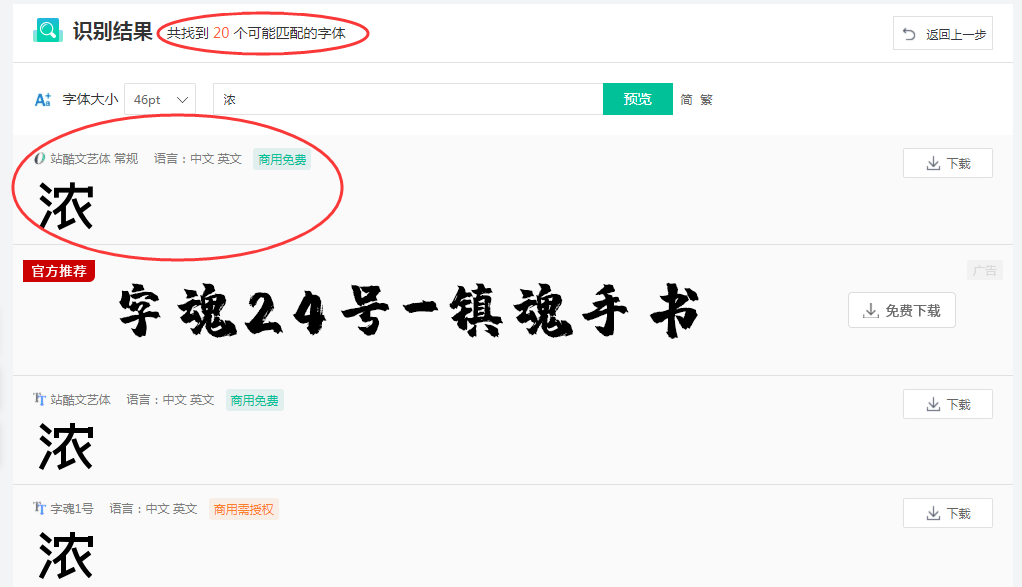 显示字体识别结果并将网站认为最为匹配的字体排列在最上方。