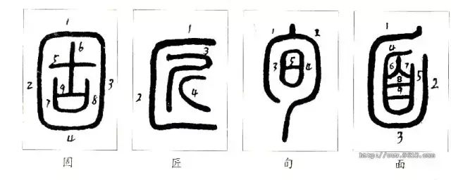 对于有字框的笔画,一般应写出外框的笔画,随后再写框内的部分。这样可以控制篆字形体的大小,避免整体不一致。