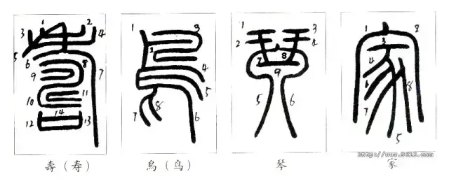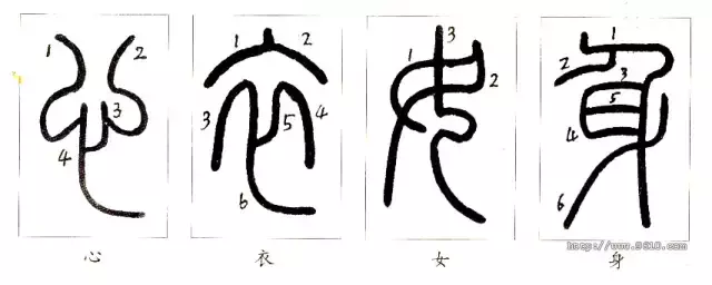 篆书的笔顺和汉字笔顺规则基本相仿,如先横后竖、从上到下、从左到右等,这些对初学者来说是不成问题的。重要的是和汉字不同的笔顺,而这些不同之处正是篆书笔顺的特点,掌握了这些特点,就能把握好篆书的结体,做到匀称匀衡。