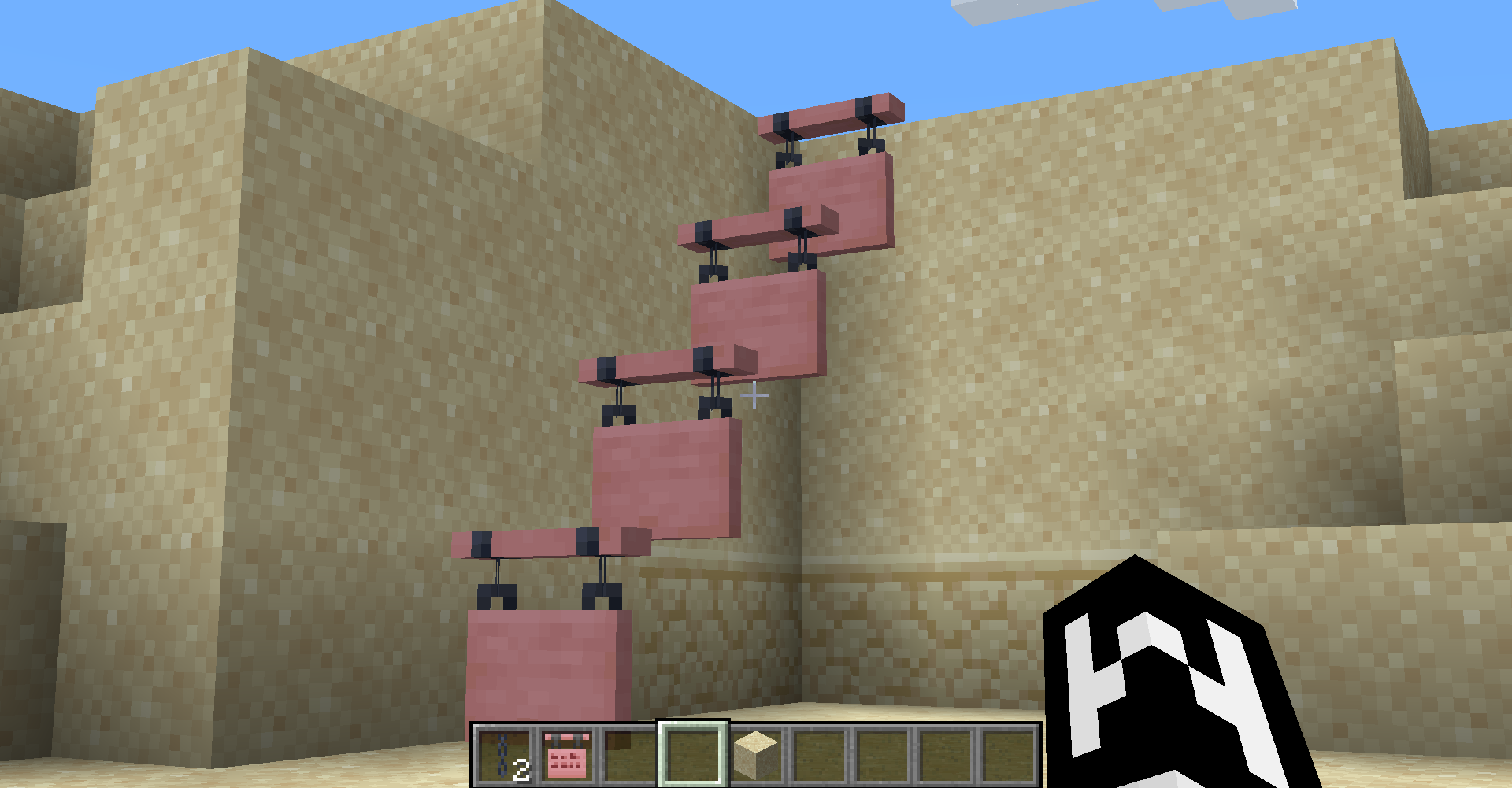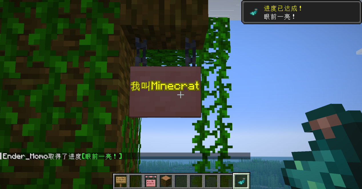 4、悬挂告示牌拥有三种放置状态:①悬挂在完整方块下方;②悬挂在类似栅栏这种小方块上,此时告示牌上的锁链会呈现三角形;③侧挂方块上,此时很不科学的凭空出现了“横杆”!