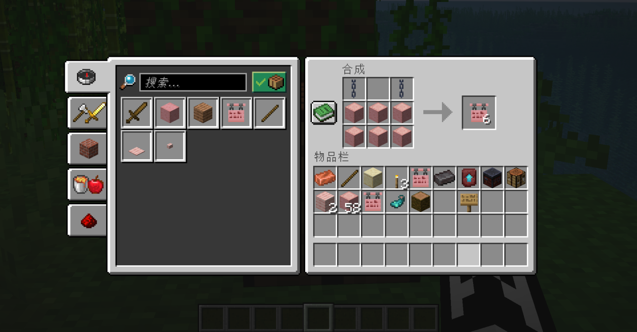 3、合成:悬挂式告示牌的合成可能很多人都不知道,它和告示牌用木板合成不同,悬挂式告示牌需要使用“6个去皮原木+2个锁链”来合成,记住这里不是木板也不是去皮木板,而是“原木”的去皮。