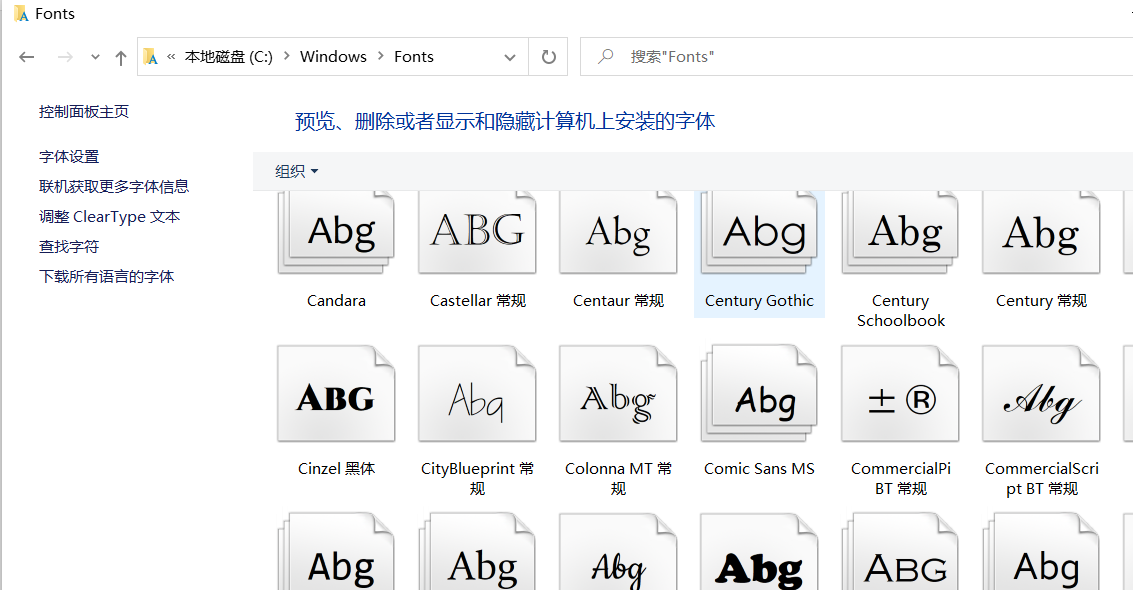 将打开操作系统的字体库,在微软操作系统中,目录一般是C:\Windows\Fonts,打开后如下图: