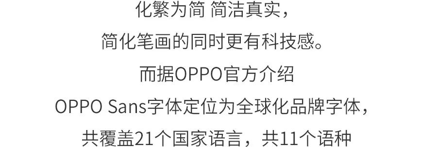 OPPO Sans 是OPPO的品牌定制字体,作为系统内置字体首发于旗下的 ColorOS 6 手机操作系统,与一般的黑体相比,OPPO Sans 采用了全新骨架,中宫自然舒适,结构稳定,字形舒展,视觉重心的提高,整体造型看起来挺拔优雅,充满生命力。