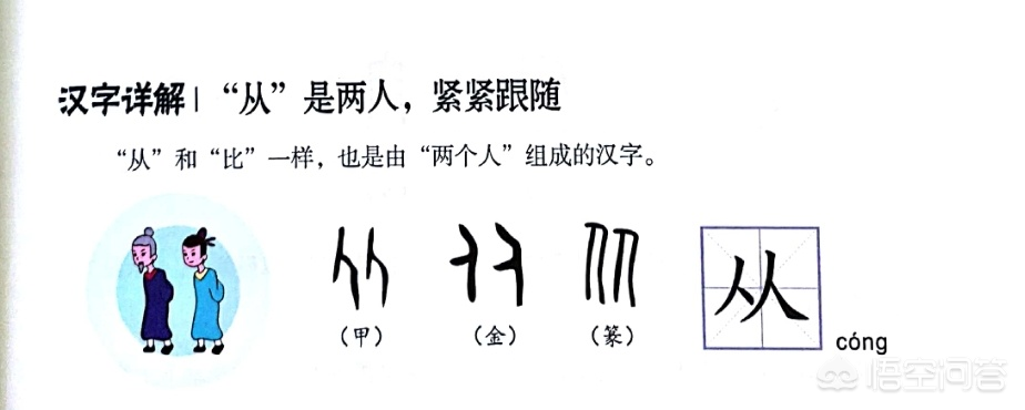 “从”很好理解,即“一个人跟着另一个人”的样子,表示“跟随、随从”的意思。如图所示: