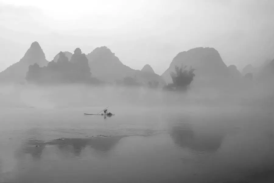 然而,在那空阔的留白处,并非一无所有,却是留下了无尽的想象和纷纷的心事。有的人在画里看到了潮平两岸阔,江上烟波浩渺。垂钓的渔人独立于江中,却不为万物所扰,仿佛与天地相通,心境像这留白的江面一般,平静自由。