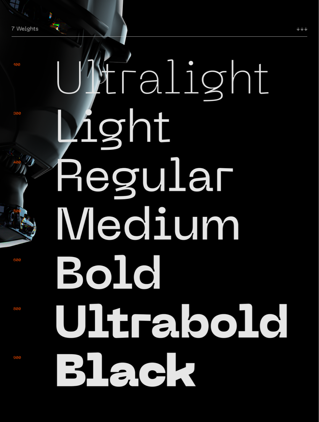 这款字体有7个字重,从细到粗,并且大小写很好看,充满了科技韵味。