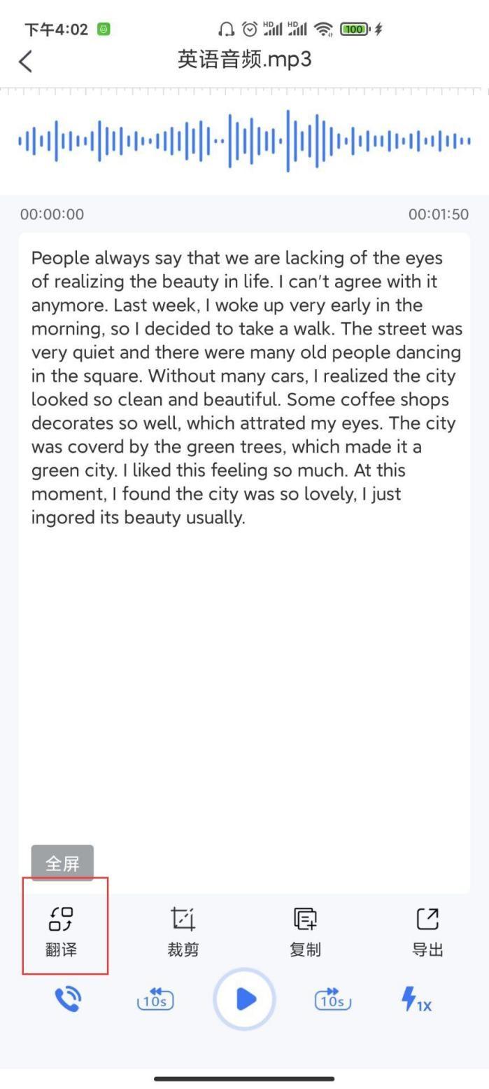 之后大概几秒钟系统就会识别出音频中的内容文字并显示在页面上,然后我们就可以对其识别出的文字进行操作了,当然如果我们想要将这段英文进行翻译,想把它翻译成中文,我们直接点击【翻译】—【翻译成中文】即可!