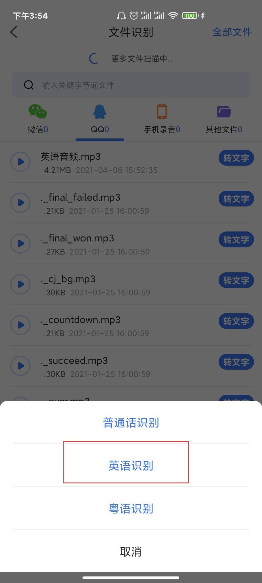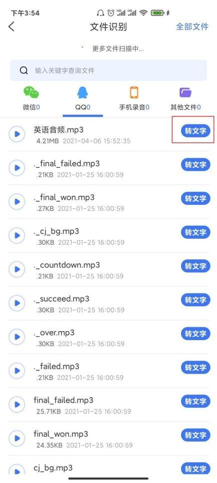 然后软件会自动识别手机内的音频文件,我们找到需要转换为文字的音频文件,点击后方的“转换文字”。点开之后,有三个选项,普通话识别、英语识别、粤语识别等,我们点击“英语识别”就可以了!