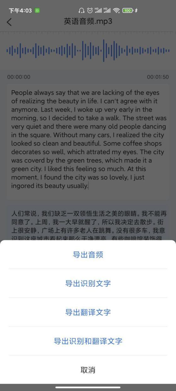 翻译完成之后,我们可以点击“导出”,将音频转换成中文文本或者翻译完成的中文文本导出去。