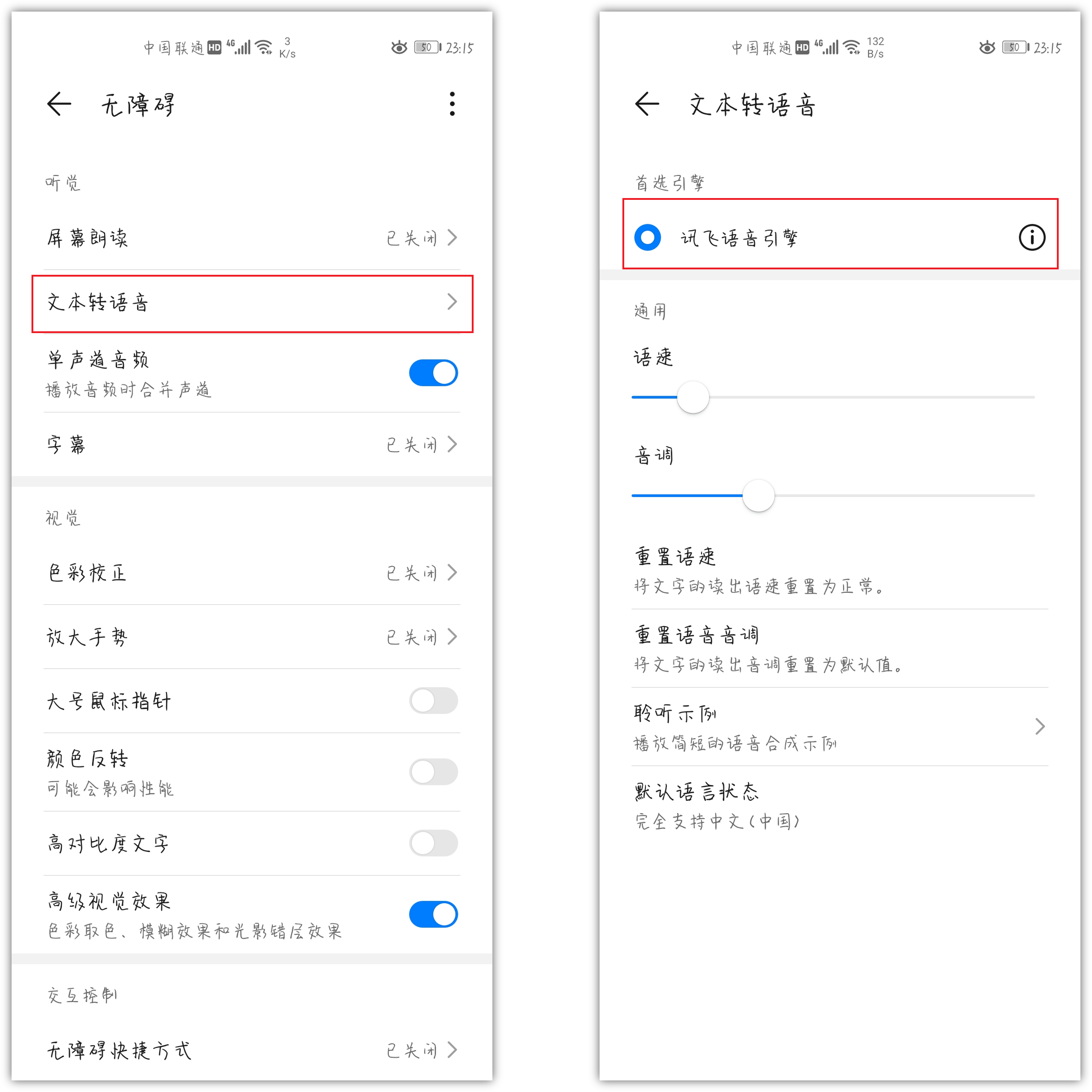 2.返回到上一页,点击进入【无障碍】,你会看到这里有一个【文本转语音】选项,进入后设置语速和音调,再点击首选语音引擎。