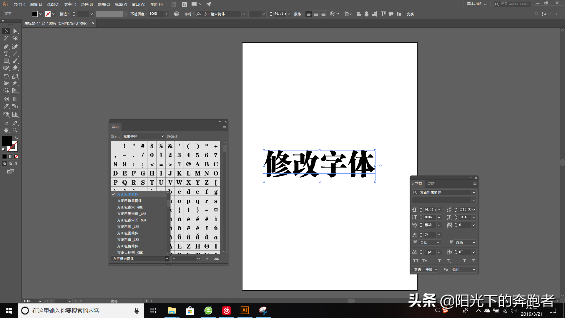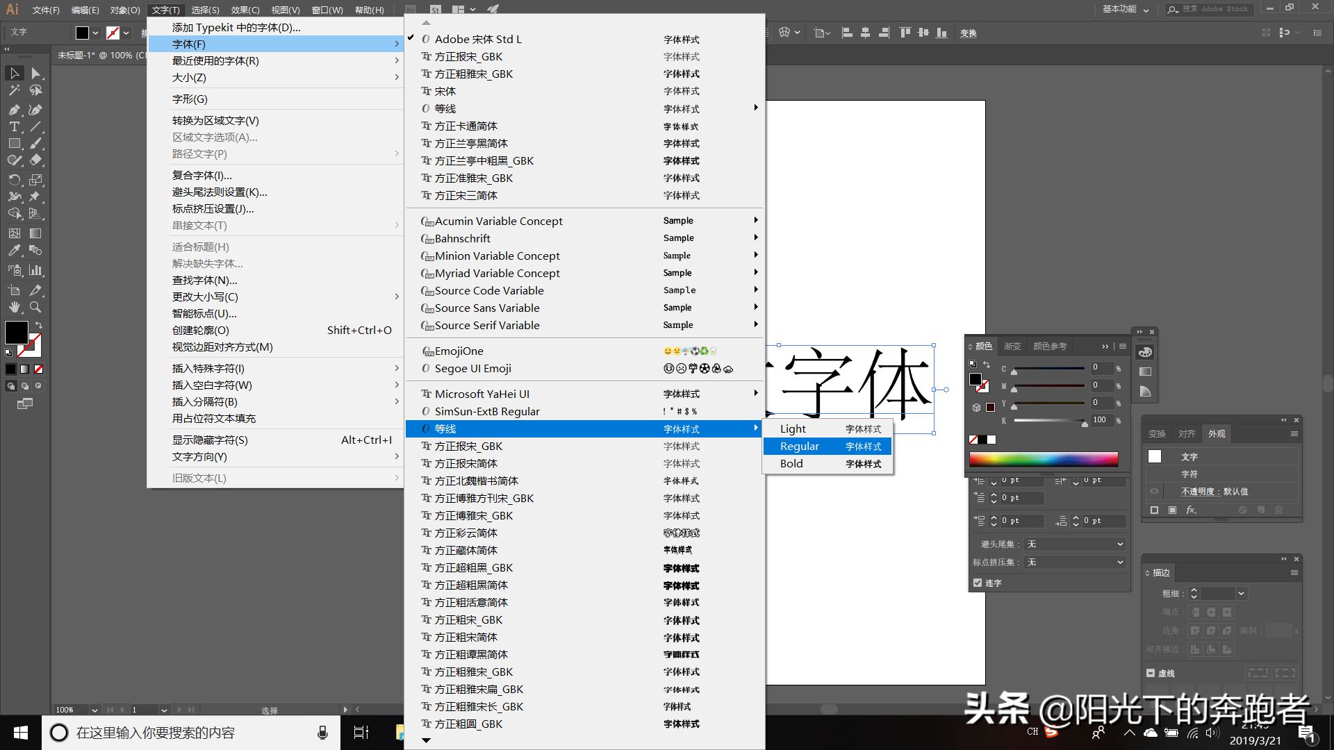 AI默认的字体是Adobe 宋体,许多时候,这并不是我们希望使用的字体。这时,我们可以选中文字,选择“文字”-“字体”,此时,列表中就会显示电脑中已安装的字体。最上方显示的是最近使用的字体。如果某个字体后面有一个三角箭头,表示这是一个系列的字体,一般可以选择不同的粗细。