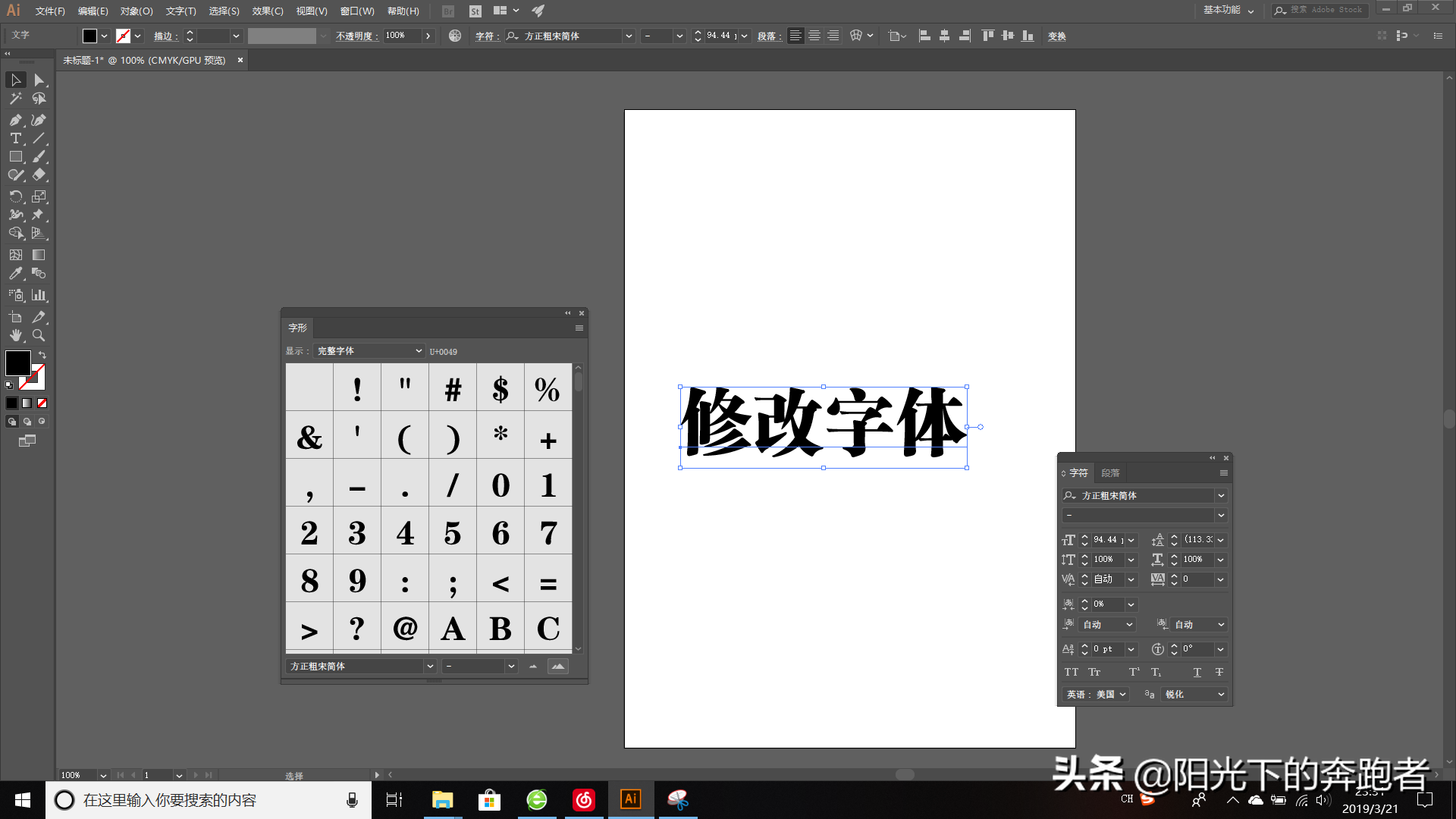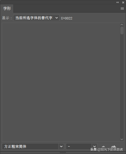 我们在“字形”面板的左下角的下拉菜单中选择一种字体,面板中就会显示当前字体的所有字符和符号。