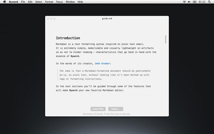 Byword 是 Markdown 写作工具中的另类,比 Typora 还要简洁,连实时预览都没有,打字机模式、段落聚焦等设计显然是希望你能专注于写作这件事。价格适中,Mac 版 73 元,iOS 版 40 元。