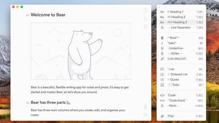 Markdown 写作器的后起之秀,高颜值是一大亮点,支持加密,不过 Bear 的定位更偏向笔记而非纯粹的写作工具。