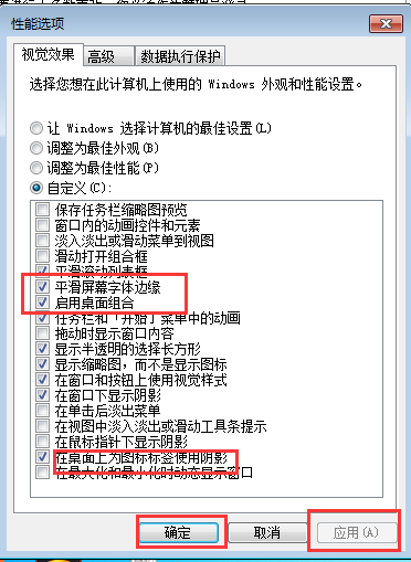 在性能选项“”勾选下图的三项内容,最后点击“应用”和“确定”即可