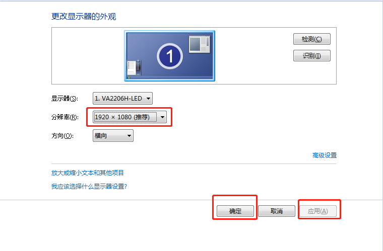 接着把桌面分辨率设置为“推荐分辨率”,点击“应用”然后点击“确定”