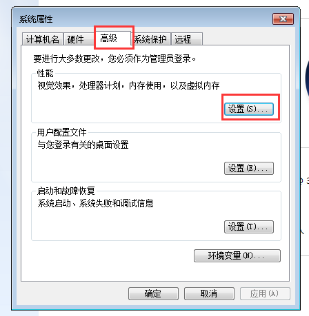 然后在新窗口里选择“高级”里边的“性能”-“设置”