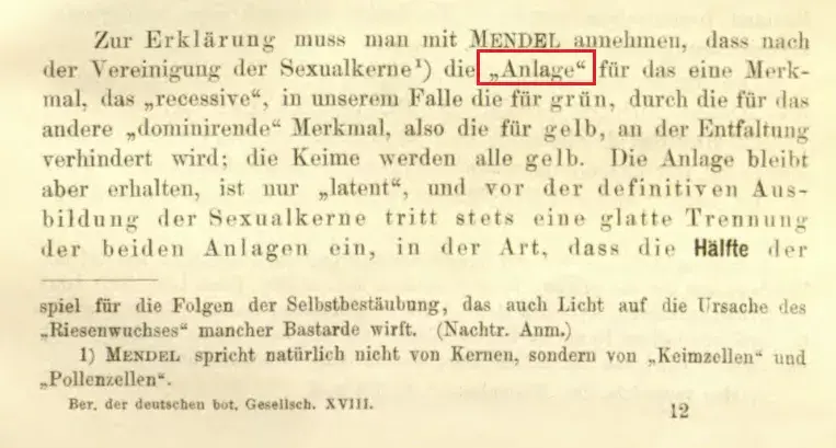德语 “Anlage” 一词有七种含义(包括创造、投资、设施、装置、结构、天性、材料),在孟德尔上面的文字里,翻译成 “天性” 可能相对贴切一些。在这里,孟德尔用 “天性” (Anlage)这个词来描述豌豆花粉细胞和卵细胞里含有的遗传物质,因为这一段之前论文已经描述了单个和多个性状杂交的情况,这里的遗传物质并不是指单个基因,而是多个基因或者是整个生殖细胞里的所有遗传物质。