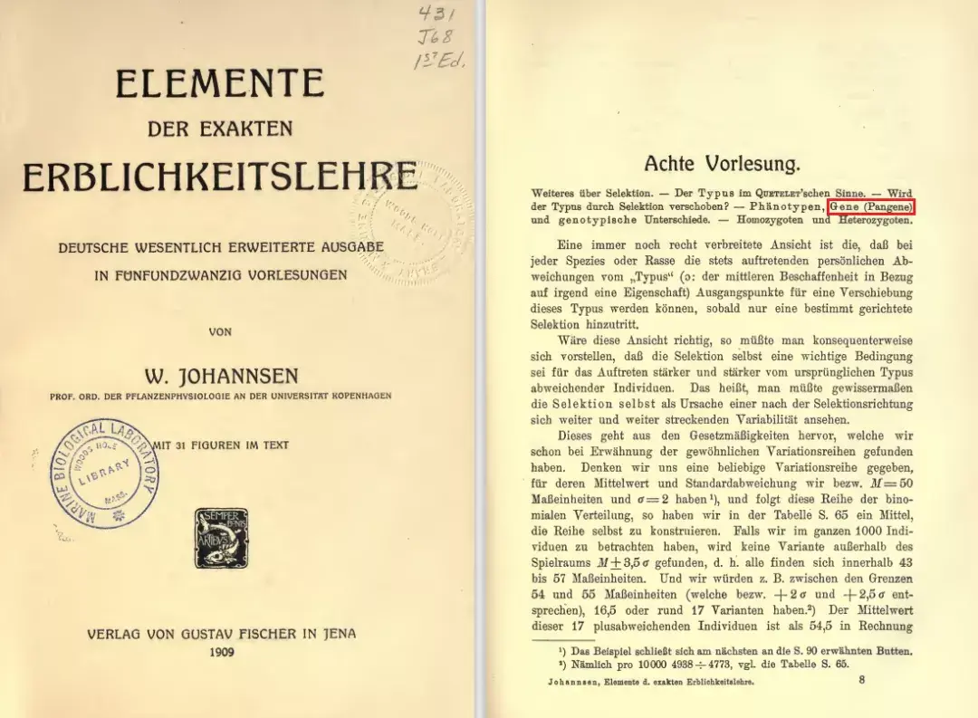 维尔海姆·路德维希·约翰森(Wilhelm Ludvig Johannsen)1857年出生于丹麦的哥本哈根,1905年获得哥本哈根大学的植物学教授职位。1909年,他出版了自己的代表作《精确遗传学理论的要素》一书。和德·弗里斯的《细胞内泛生论》一样,约翰森《精确遗传学理论的要素》一书也是由德国耶拿的GUSTAV FISCHER出版社用德语发行 [6]。