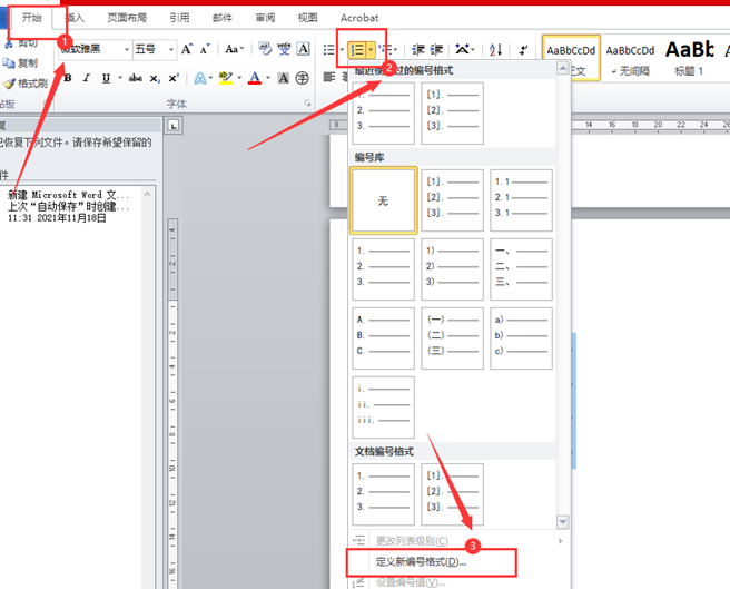 参考文献导入后,选中参考文献,点击菜单栏【开始】——【编号】——【定义新编号格式】