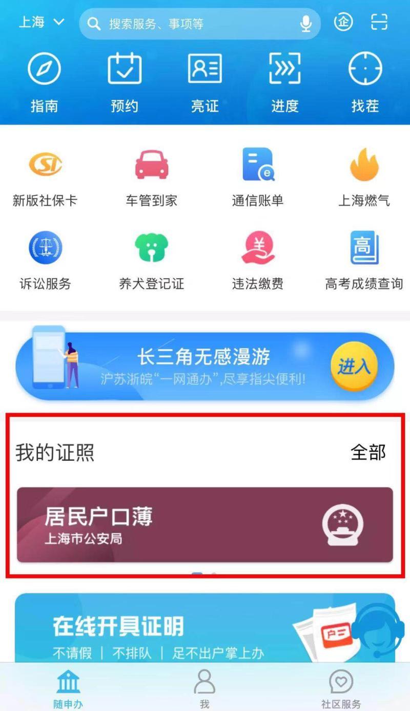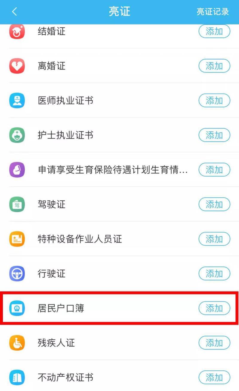 那么,电子版《居民户口簿》如何获取?市民可先下载“随申办市民云”APP,打开APP点击左下角“随申办”,在首页有一个“亮证”功能,进入后,点击居民户口簿一栏的“添加”选项,就可以在首页直接看到电子版《居民户口簿》了。