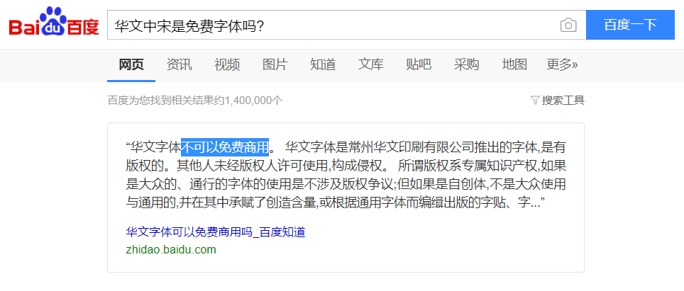 如果查不到,那么你可以去百度上直接搜索“某款字体是否可商用”,一般也能搜到相关信息: