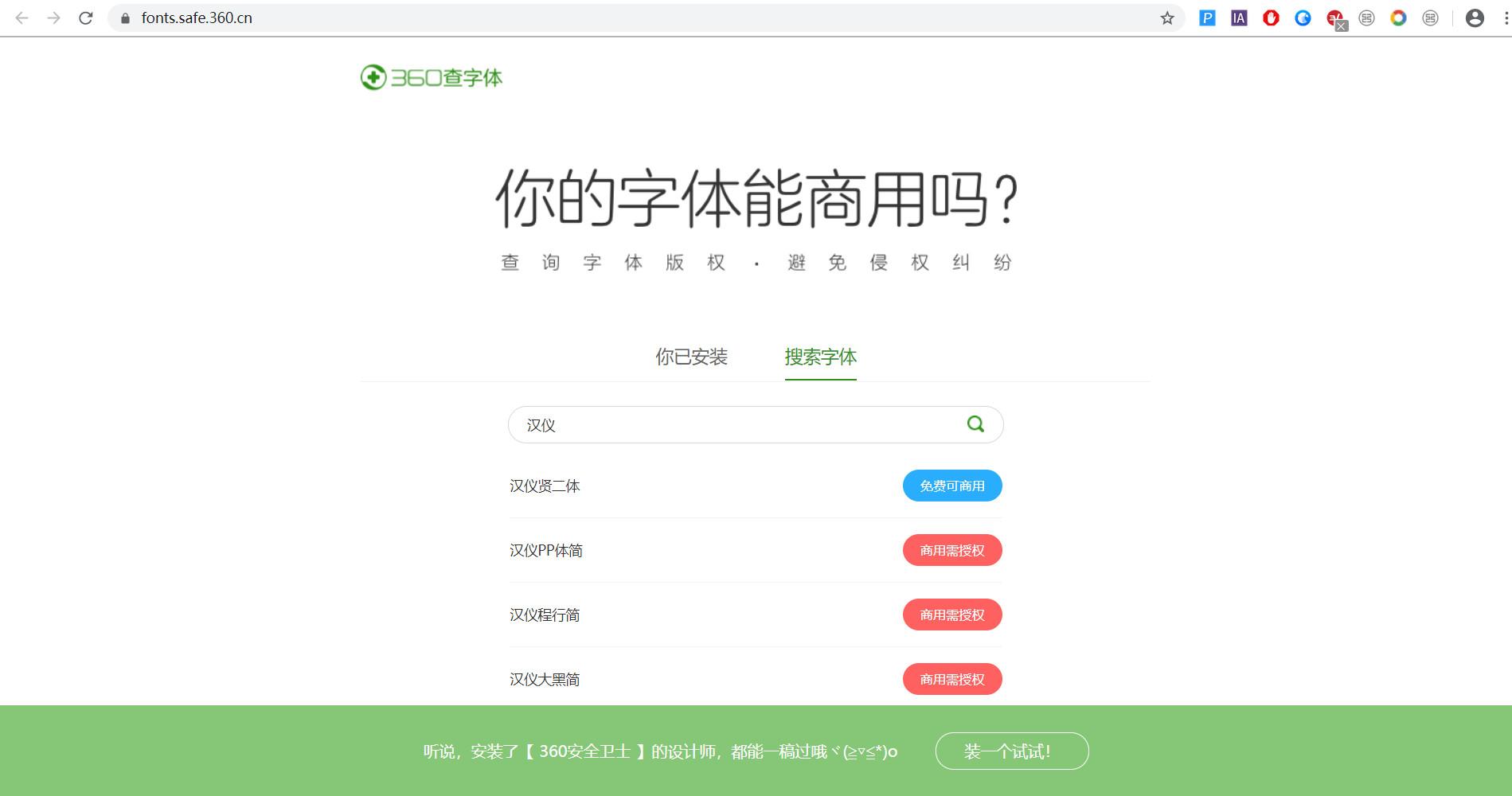 直接上“360查字体”网,一般输入字体名字就可以查到该款字体是否免费:
