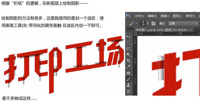 五、根据“折纸”的逻辑,在新图层上绘制阴影。绘制阴影的方法有很多,这里我使用的是划一个选区,使用画笔工具,带羽化的黑色笔触在选区内划一下即可。
