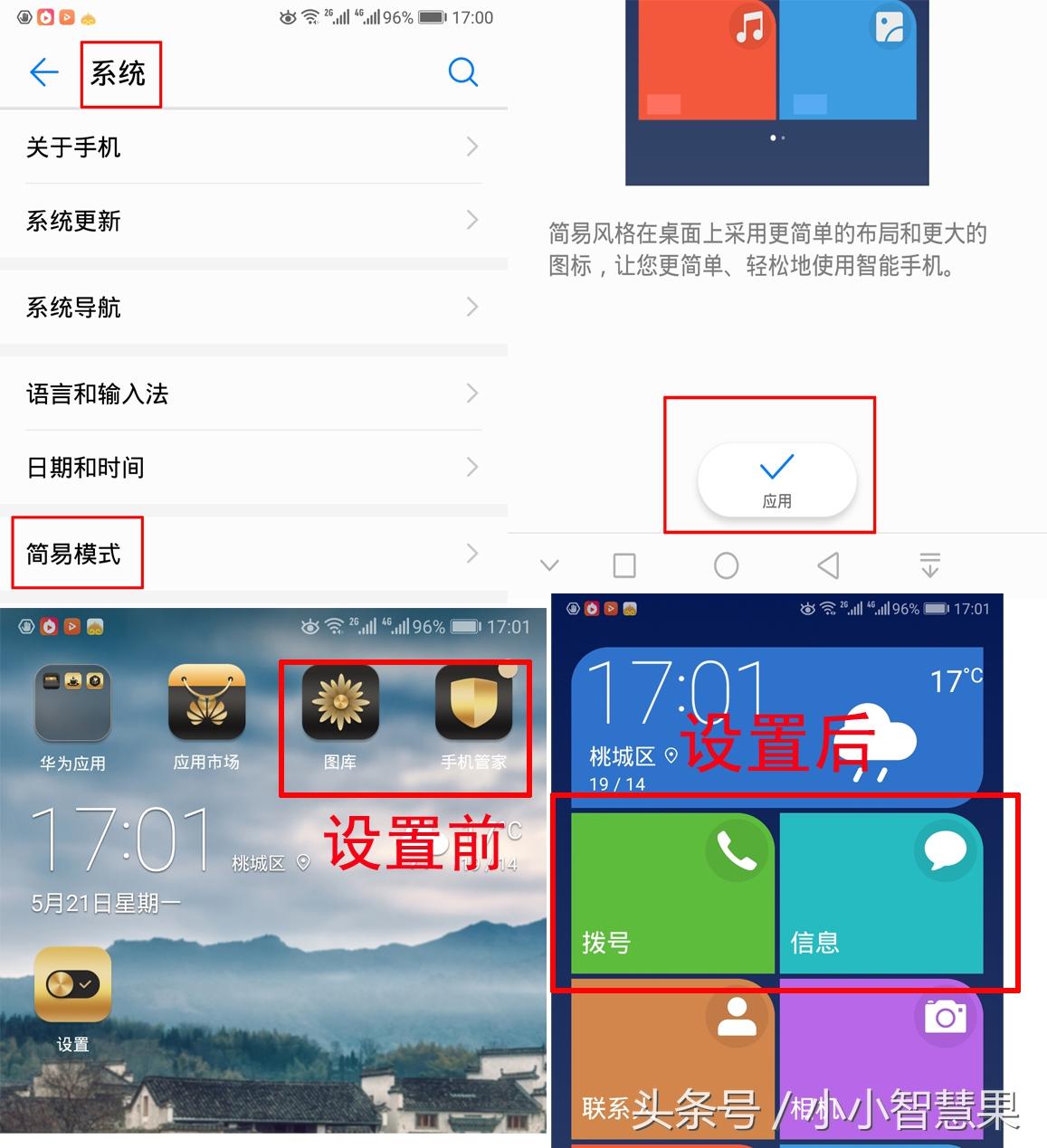 设置方式:打开华为手机【设置】-【系统】-【简易模式】勾选应用,这时候你会发现原先桌面的图标样式已经发生了变化,并且图标下面的字也变大了。
