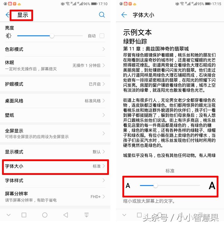 我们可以通过改变字体大小来进行缩小或放大屏幕上的文字,设置方式【设置】-【显示】-【字体大小】系统自带四种字体大小【小】【标准】【大】【特大】,同样,我们可以滑动下方的调节按钮来选择适合自己的字体大小。