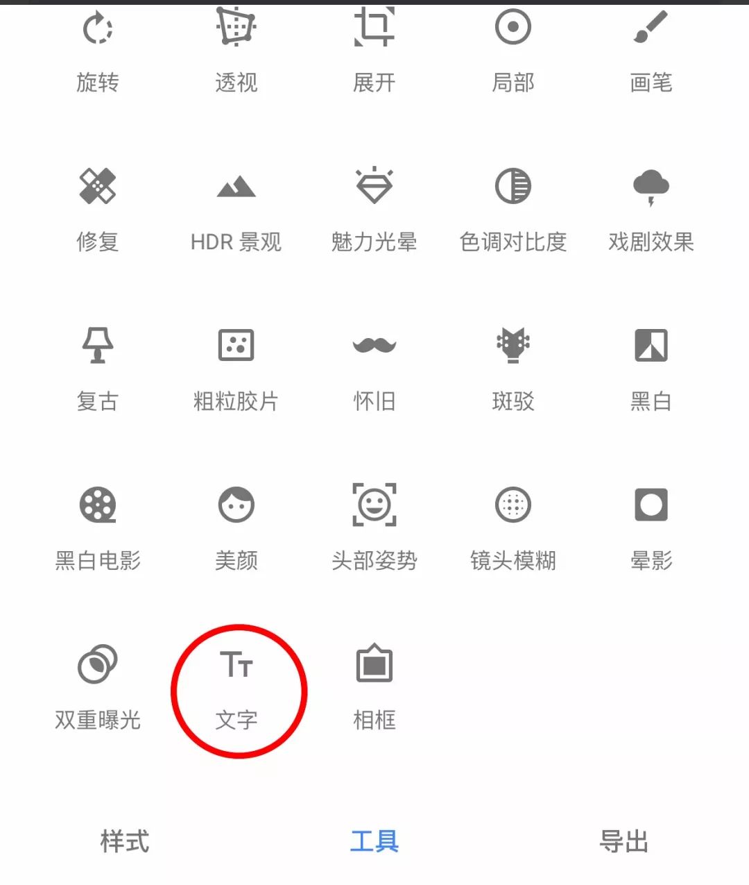 在snapseed软件中导入图片,工具栏中下拉倒倒数第2项,点击【文字】工具,并且输入想要的文字: