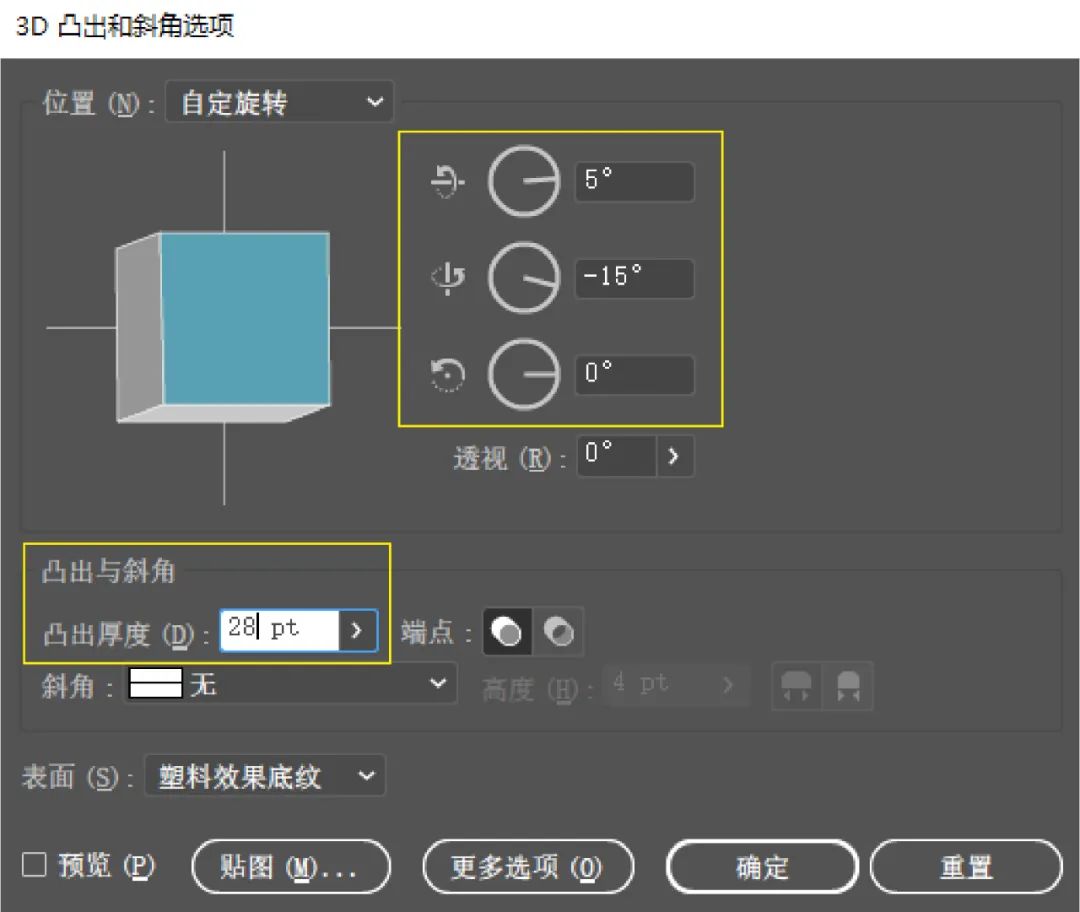 在菜单栏选择,效果→3D→凹凸和斜角,面板中三个轴的参数,分别是5 、-15、0,凸出厚度为28pt: