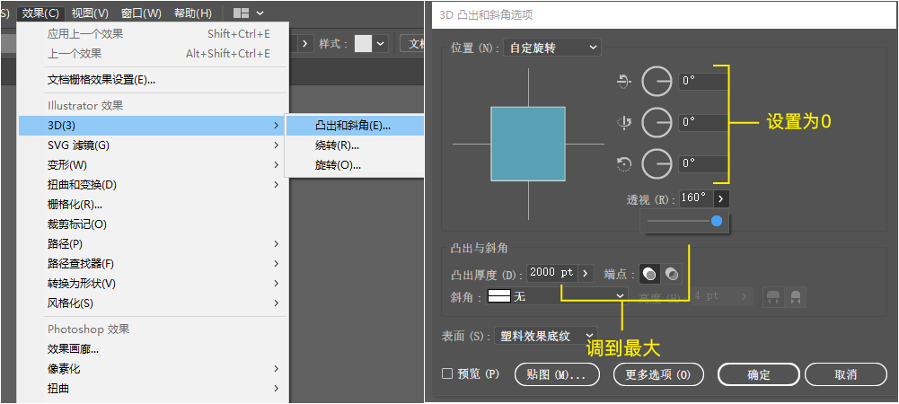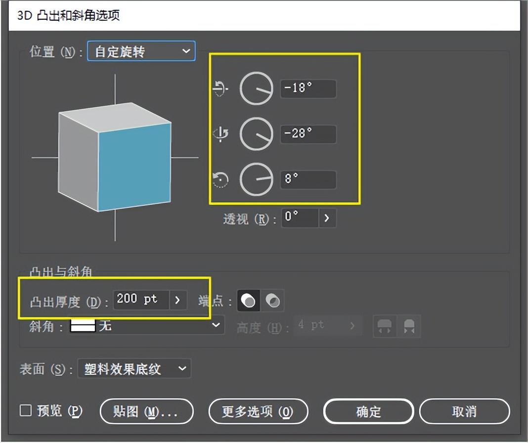 然后在菜单栏在菜单栏选择,效果→3D→凸出和斜角,面板中三个轴的参数分别是 -18、-28、8,凸出厚度为200: