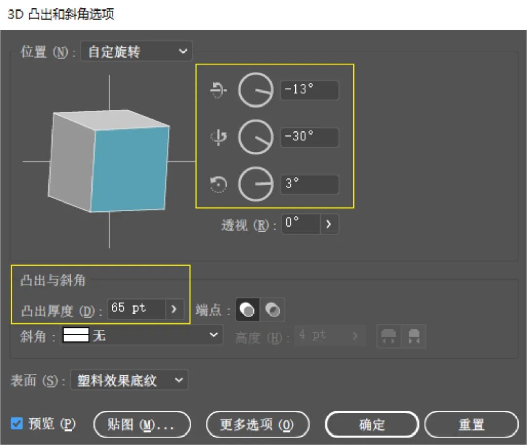 在菜单栏选择,效果→3D→凹凸和斜角,面板中三个轴的参数,分别是 -13、-30、3,凸出厚度为65pt: