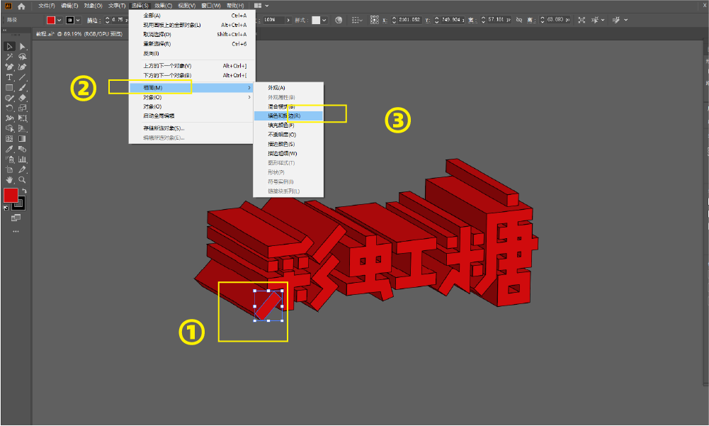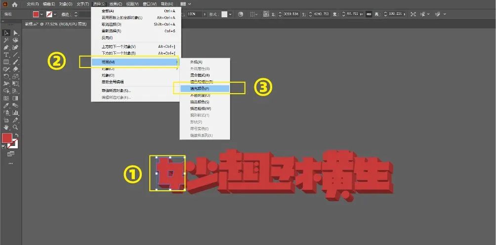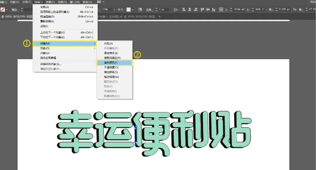③现在来给它上色,先从字的正面开始,先任意选中一个笔画,选择→相同→填色和描边: