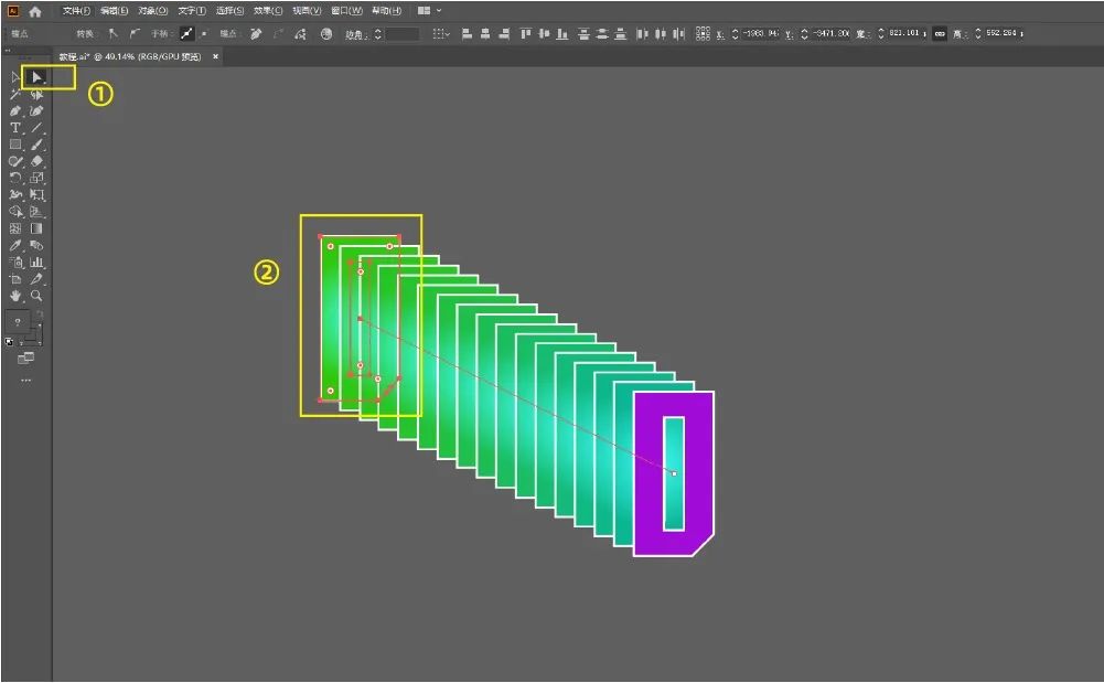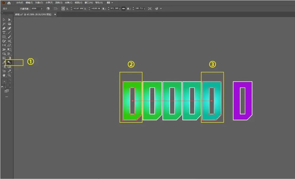 ②框选中前面两个带渐变的字,选择混合工具,依次点击框选中的第一个字和第二个字:
