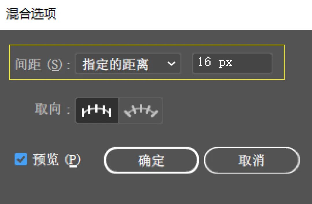 框选住混合后的字体,按住ALT键然后点击鼠标左键调出混合工具面板。下拉选项,选中指定的距离一栏,参考数值如下。(具体数值根据实际情况调整,数值越小,混合距离越密集。数值越大,混合距离越松散。)