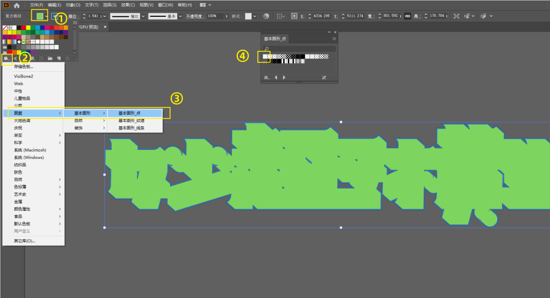 选中第一层绿色的字,点击填充,然后点击左下角的储色板→图案→基本图形→基本图形-点,然后在基本图形-点面板中选择第一个: