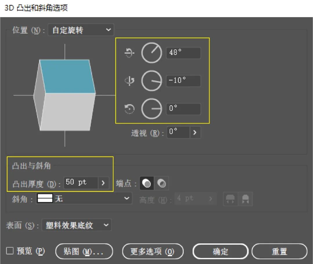 ②在菜单栏选择,效果→3D→凹凸和斜角,面板中三个轴的参数,分别是 48、-10、0,凸出厚度为50pt: