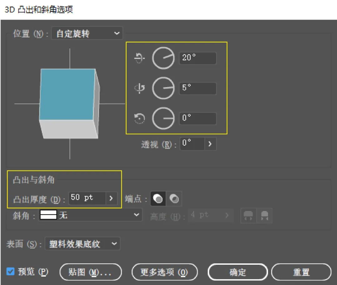 在菜单栏选择,效果→3D→凹凸和斜角,面板中三个轴的参数,分别是 20、5 、0,凸出厚度为50pt: