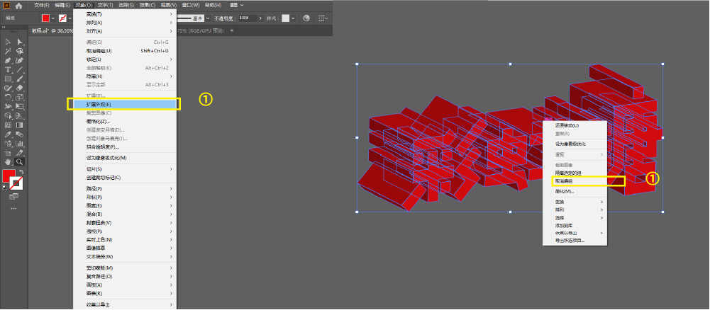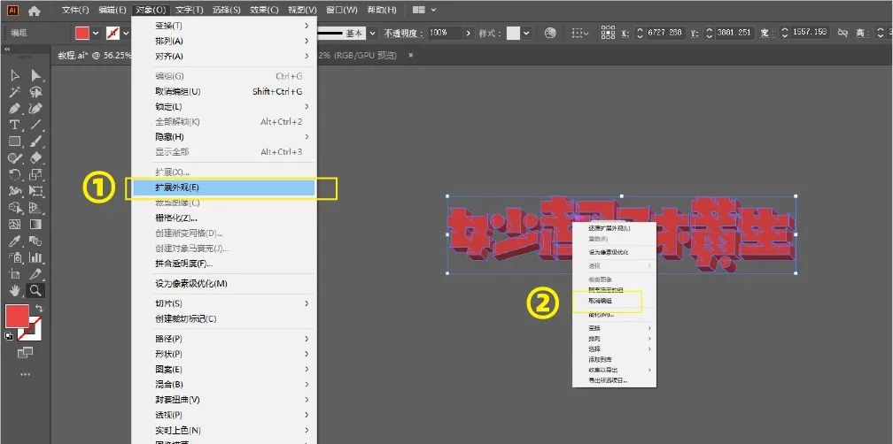 ② 选中字形,点击 对象→扩展外观,再右击→取消群组: